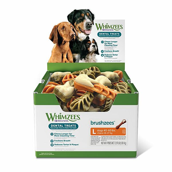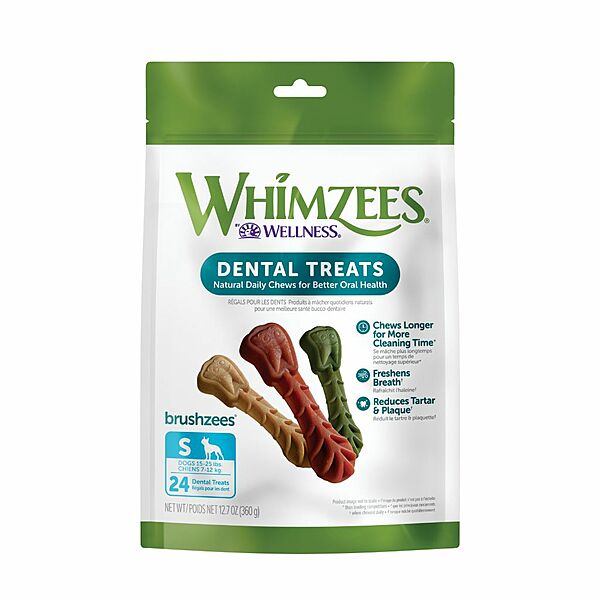 Give your dog one Whimzees brushzees per day and you're giving them a fun, all natural way to help clean teeth, freshen breath, and reduce plaque and tartar - all while they chew! These treats clean two times better than a leading competitor, and deliver three times longer chew time. A longer chew time means a longer cleaning time - all to support your dog's dental health. You brush daily, your dog should too!